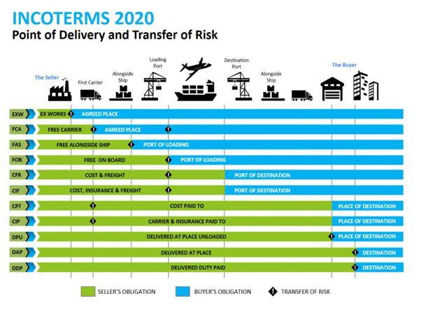 The chart below lists the current Incoterms® along with where the obligations lie and where the transfer of risk applies.